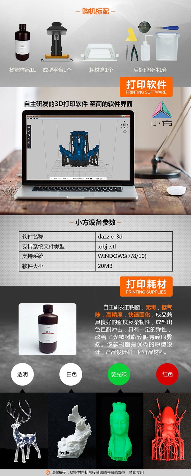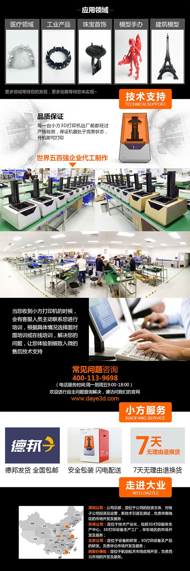 小方3D打印機(jī)屬于桌面級(jí)SLA(樹(shù)脂激光固化成型)高精度打印機(jī),最高精度0.025mm/層,廣泛應(yīng)用于藝術(shù)創(chuàng)意,教育,珠寶,醫(yī)療行業(yè)。
