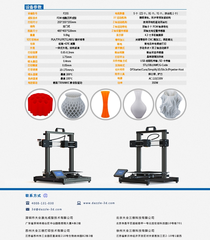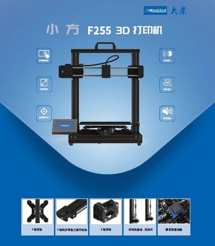 小方F255 3d打印機是一款采用全金屬設計的一款經典大氣的桌面級FDM 3d打印機,設備具備斷電續打、斷料續打、全彩智能觸摸的一款高精度3d打印機,設備成型尺寸25X25X25厘米,可打印pla/tpu/petg/ABS/碳纖維等多種材料,行業應用廣泛!